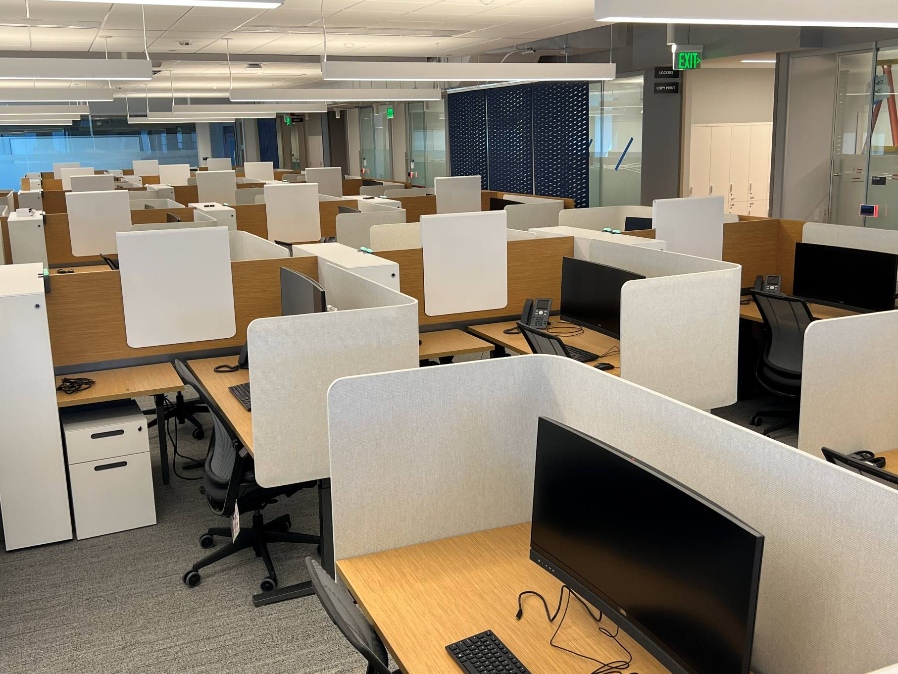 Furniture systems include traditional “cubicles” and trading or benching workstations linked with integrated power and data, all intended to turn open areas into efficient work spaces for large numbers of employees.